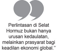 Selat Hormuz saat ini menjadi sorotan dunia mengingat letaknya yang menjadi medan laga kepentingan Iran-Israel. Sebanyak 20 persen pasokan minyak dunia mengalir melalui selat tersebut. Eskalasi konflik di area itu berpotensi melambungkan harga minyak mentah bagi dunia. Tiap riak di selat itu menimbulkan efek domino multibidang yang merayap cepat lintas wilayah. Bagi Indonesia, kedaulatan ekonomi domestik bisa terancam secara langsung.