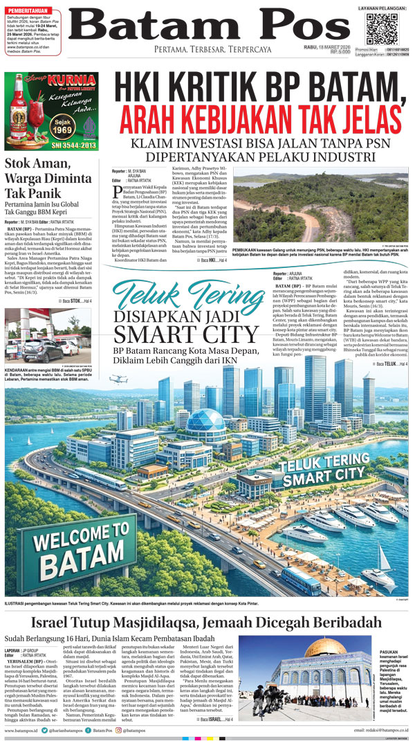 Silakan berlangganan untuk bisa membaca keseluruhan berita di Harian Batam Pos. ﹢ Berlangganan Baca Juga 26 Maret 2026 26 Maret 2026 WhatsAppTelegram 18 Maret 2026 18 Maret 2026 Buka konten iniDengan mendaftarkan diri Anda di Harian Batam Pos, Anda akan mendapatkan akses penuh ke seluruh konten.SubscribeKami tidak akan mengirimkan email yang tidak berkaitan dengan akun Anda.Saya setuju untuk memperoses data saya sesuai dengan Aturan Layanan yang disediakan.