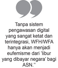 Belum lagi persoalan integritas jam kerja. Saat masih berkantor saja, kita sering menemukan kasus keterlambatan pegawai, pulang lebih awal, hingga fenomena ’’ngopi di warung’’ pada jam dinas. Tanpa sistem pengawasan digital yang sangat ketat dan terintegrasi, WFH/WFA hanya akan menjadi eufemisme dari ’’libur yang dibayar negara’’.