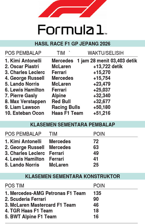 SUZUKA (BP) — Rekor itu akhirnya datang lebih cepat dari perkiraan. Andrea Kimi Antonelli resmi menjadi pembalap termuda yang memimpin klasemen Formula 1 setelah menjuarai Grand Prix Jepang 2026 di Sirkuit Suzuka, Minggu (29/3).