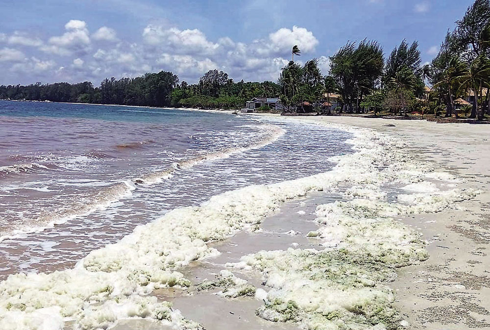 Dari video yang diterima Batam Pos, zat tersebut tampak terdorong ombak hingga menumpuk di bibir pantai. Bentuknya menyerupai busa dengan warna kehijauan yang cukup mencolok.