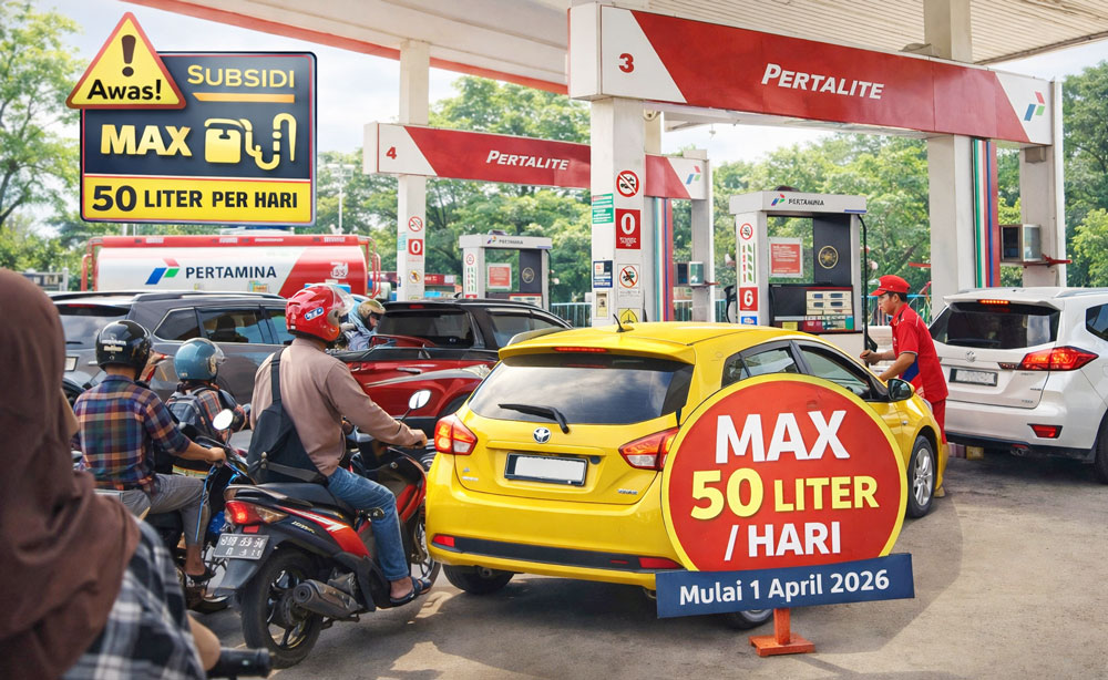 Pemerintah secara resmi mulai mengatur pembelian BBM bersubsidi untuk kendaraan pribadi. Mulai 1 April 2026, setiap mobil pribadi dibatasi maksimal 50 liter per hari.