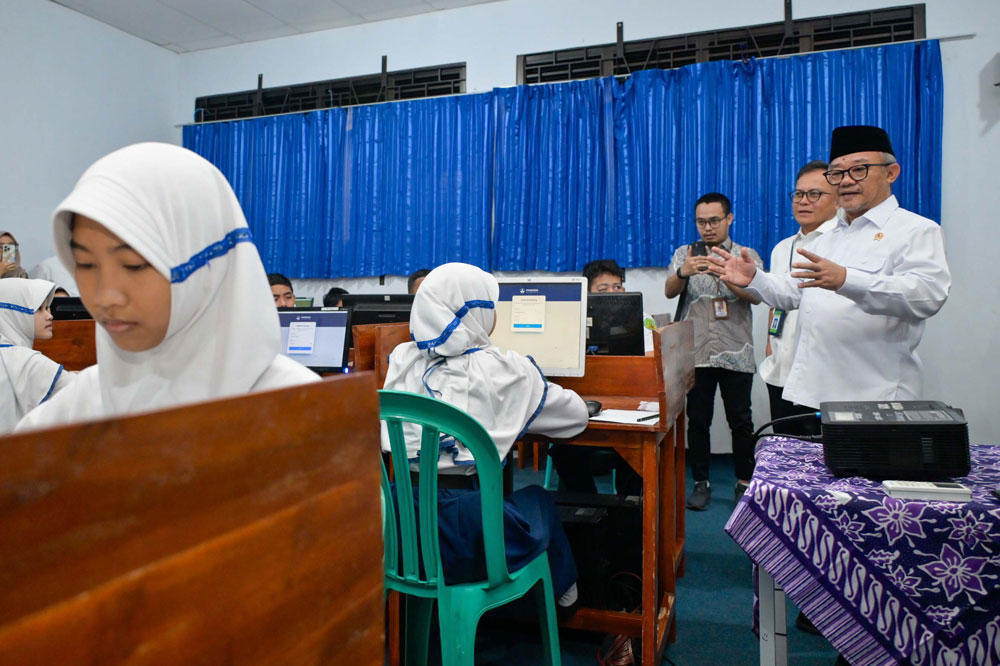 Menteri Pendidikan Dasar dan Menengah, Abdul Mu’ti, meninjau langsung pelaksanaan TKA di SMP Negeri 2 Curug, Kabupaten Tangerang, Banten, Senin (6/4). Dari hasil pemantauan, ia menilai kesiapan sekolah sudah sesuai prosedur, baik dari sisi teknis maupun penataan ruang ujian.
