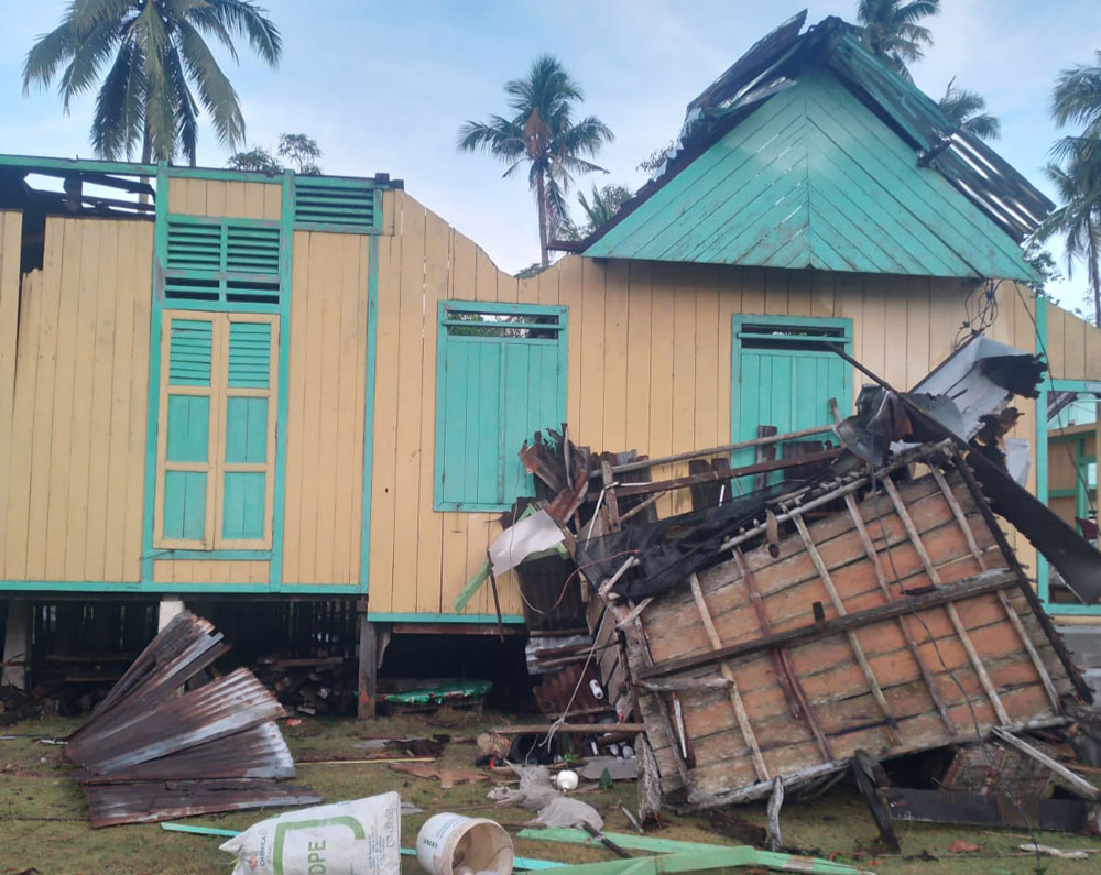 Atap seng, rangka kayu, hingga bagian bangunan lainnya terlepas. Bahkan, beberapa lembar seng ditemukan tersangkut di pohon durian sejauh sekitar 100 meter dari lokasi.