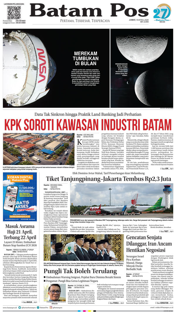 Silakan berlangganan untuk bisa membaca keseluruhan berita di Harian Batam Pos. ﹢ Berlangganan Baca Juga 17 April 2026 17 April 2026 WhatsAppTelegram 10 April 2026 10 April 2026 Buka konten iniDengan mendaftarkan diri Anda di Harian Batam Pos, Anda akan mendapatkan akses penuh ke seluruh konten.SubscribeKami tidak akan mengirimkan email yang tidak berkaitan dengan akun Anda.Saya setuju untuk memperoses data saya sesuai dengan Aturan Layanan yang disediakan.
