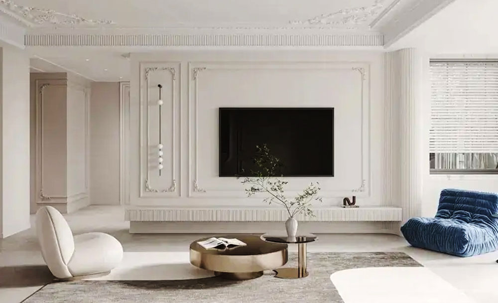 Bagi ruang tamu yang dilengkapi televisi, wall moulding gypsum bisa dimanfaatkan sebagai bingkai TV untuk menghadirkan kesan klasik modern tanpa perlu banyak furnitur.