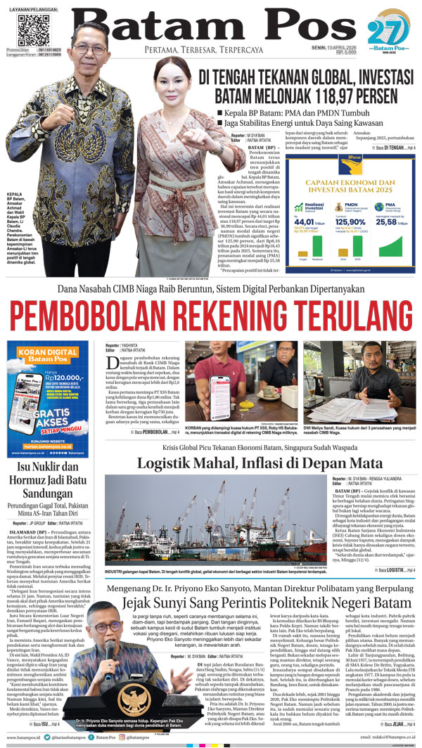 Silakan berlangganan untuk bisa membaca keseluruhan berita di Harian Batam Pos. ﹢ Berlangganan Baca Juga 17 April 2026 17 April 2026 WhatsAppTelegram 13 April 2026 13 April 2026 Buka konten iniDengan mendaftarkan diri Anda di Harian Batam Pos, Anda akan mendapatkan akses penuh ke seluruh konten.SubscribeKami tidak akan mengirimkan email yang tidak berkaitan dengan akun Anda.Saya setuju untuk memperoses data saya sesuai dengan Aturan Layanan yang disediakan.