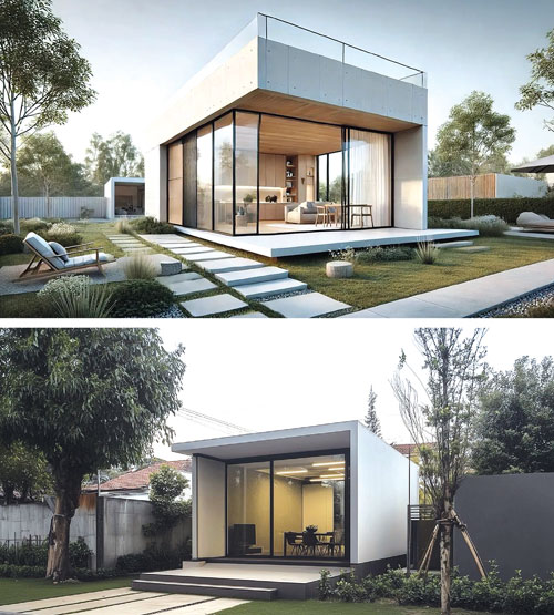 Ciri khas rumah minimalis terlihat dari penggunaan bentuk sederhana dan garis-garis geometris. Desain fasad yang tegas dipadukan dengan warna netral seperti putih, abu-abu, dan hitam mampu menghadirkan kesan modern sekaligus bersih. Bentuk geometris juga memudahkan proses pembangunan dan perawatan rumah. Desain yang tidak rumit membuat biaya konstruksi lebih efisien tanpa mengurangi nilai estetika.
