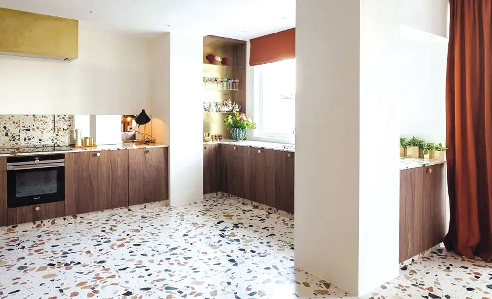 Motif teraso atau terrazzo menawarkan tampilan unik dengan corak abstrak yang menarik. Keramik jenis ini biasanya dibuat dari campuran pecahan marmer, batu alam, atau keramik yang dipadukan dengan semen putih. Selain tampil estetis, permukaannya yang cenderung tidak licin menjadikannya pilihan tepat untuk dapur yang mengutamakan keamanan sekaligus keindahan.