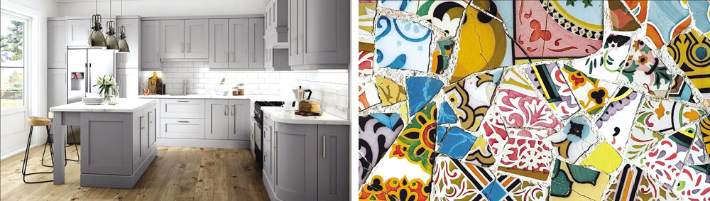 Penggunaan pecahan keramik atau motif mozaik dapat menjadi alternatif menarik untuk menciptakan tampilan dapur yang unik dan artistik. Motif seperti segitiga atau pola geometris lainnya mampu memberikan kesan modern. Agar hasilnya maksimal, penting untuk menyesuaikan warna keramik dengan kitchen set sehingga tercipta harmoni visual yang seimbang, sekaligus tetap memperhatikan aspek keamanan dengan memilih permukaan yang tidak licin.