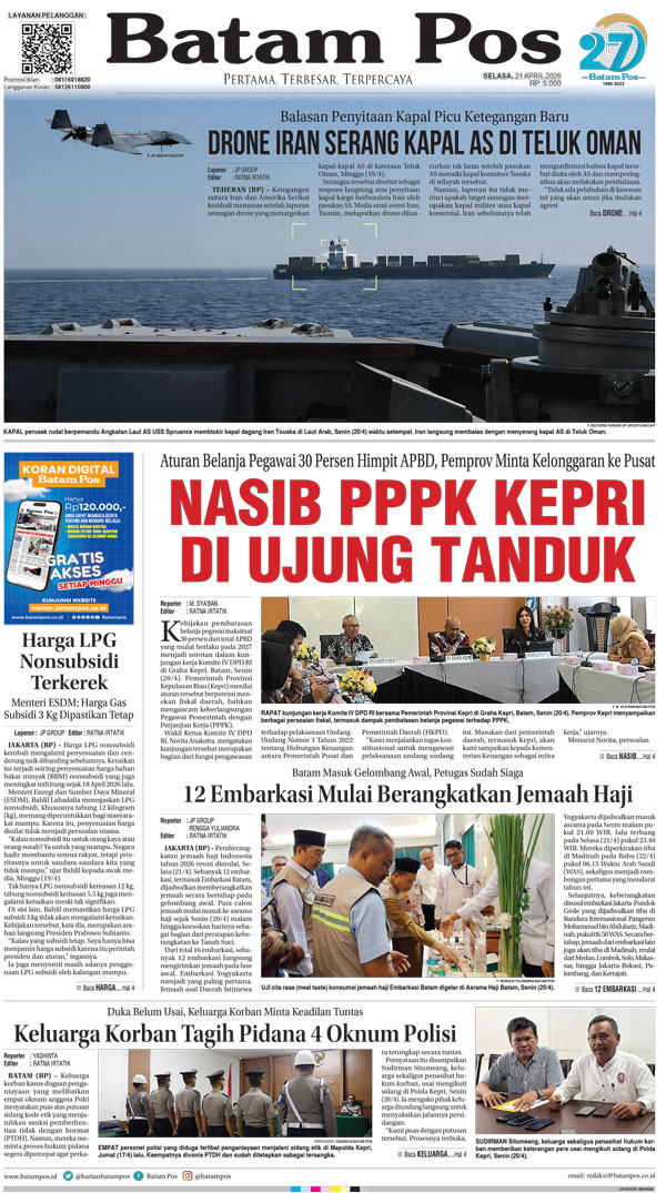 Silakan berlangganan untuk bisa membaca keseluruhan berita di Harian Batam Pos. ﹢ Berlangganan Baca Juga WhatsAppTelegram 21 April 2026 21 April 2026 Buka konten iniDengan mendaftarkan diri Anda di Harian Batam Pos, Anda akan mendapatkan akses penuh ke seluruh konten.SubscribeKami tidak akan mengirimkan email yang tidak berkaitan dengan akun Anda.Saya setuju untuk memperoses data saya sesuai dengan Aturan Layanan yang disediakan.