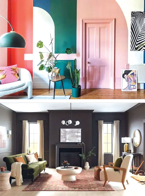 Satu bidang dinding bisa dibagi dengan proporsi berbeda untuk menciptakan ilusi visual. Cara ini membuat ruangan tampak lebih dinamis.