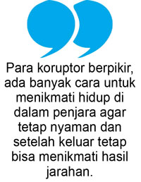 Para koruptor berpikir, ada banyak cara untuk menikmati hidup di dalam penjara agar tetap nyaman dan setelah keluar tetap bisa menikmati hasil jarahannya. Apalagi, sampai saat ini undang-undang perampasan aset yang memungkinkan harta jarahan para koruptor disita untuk negara ternyata jauh panggang dari api untuk disahkan. Itulah yang mengakibatkan nafsu untuk memperkaya diri jauh lebih besar jika dibandingkan dengan rasa takut apabila dimasukkan ke penjara.