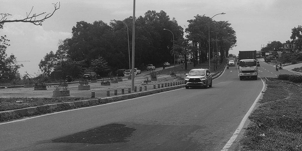 Penurunan jalan diduga terjadi akibat melemahnya struktur tanah di bawah lapisan aspal sehingga memicu deformasi pada permukaan jalan.