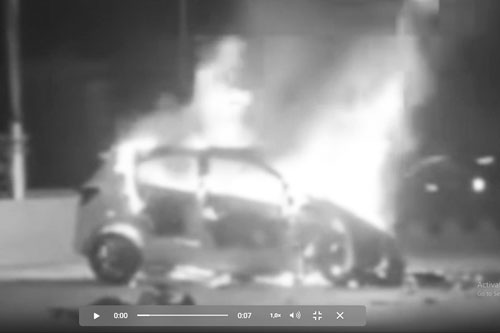 Benturan keras tersebut menyebabkan kendaraan mengalami kerusakan parah. Hampir seluruh bagian depan mobil ringsek, sementara api yang muncul setelahnya menghanguskan sebagian besar bodi kendaraan hingga nyaris tidak berbentuk.