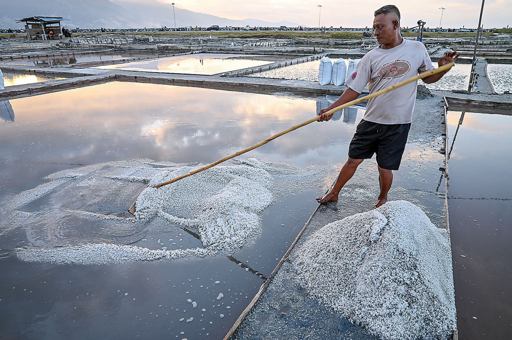 Petambak memanen garam di kawasan penggaraman Talise, Palu, Sulawesi Tengah, Selasa (28/4). Petambak setempat kembali memanen garam seiring membaiknya kondisi cuaca setelah lebih dari empat bulan tidak berproduksi akibat tingginya curah hujan. Foto: ANTARA FOTO/Basri Marzuki/wsj.